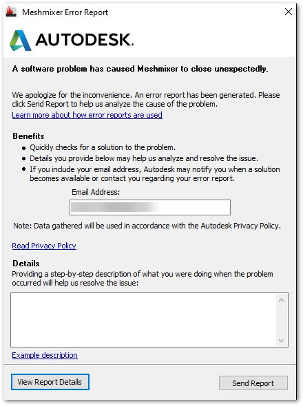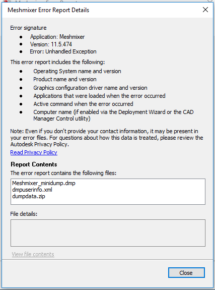 Autodesk Meshmixer Error Report